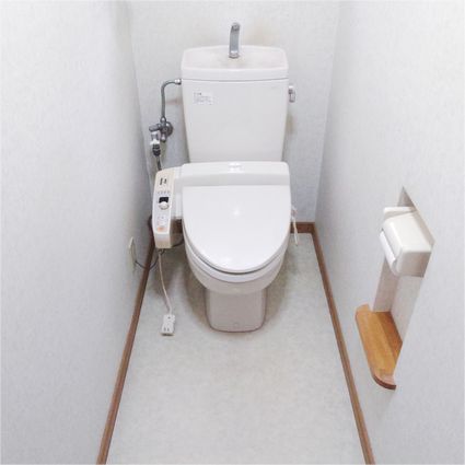 壁紙とクッションフロアの貼替も行い、トイレの室内の雰囲気が変わりました。