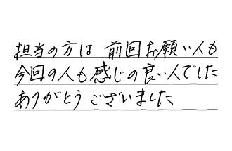 担当の方は、前回お願いした人も、今回の人も、感じの良い人でした。ありがとうございました。