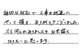 親切な対応で、工事も迅速にやって頂き、ありがとうございました。次も何かありましたら、お世話になりたいと思います。