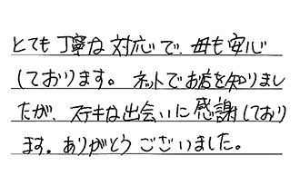 とても丁寧な対応で、母も安心しております。ネットでお店を知りましたが、ステキな出会いに感謝しております。ありがとうございました。