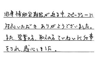 国庫補助金期限が迫る中、スピーディーに対応いただき、ありがとうございました。また、営業の方、職人の方、ていねいに仕事をされ、感心しました。