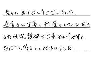 先日はありがとうございました。最後まで丁寧に作業をしていただき、また状況説明も大変わかりやすく、安心を得ることができました。