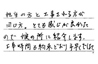 思ってた以上に早く施工していただき、又きっちりした作業でした。感謝です。