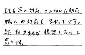 とても早い対応、ていねいな対応、職人の対応も良かったです。また何かあれば、相談したいと思います。