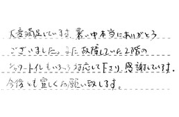 大変満足しています。暑い中、本当にありがとうございました。また故障していた2階のシャワートイレも、いろいろ対応して下さり、感謝しています。今後とも宜しくお願い致します。
