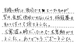 見積り時は使用できていたものが、翌日突然使用できなくなり、仮設器を取り付けて頂きました。大寒波の時だったので、大変助かりました。ありがとうございました。