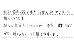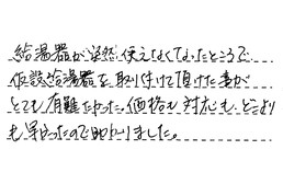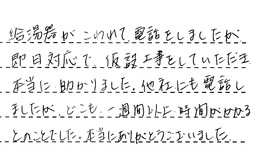 給湯器故障に伴い、修理依頼しましたところ、即対応して頂き、その日仮設置修理、後日、私共都合のよい日に取替て頂き、誠にたすかりました。ありがとうございました。