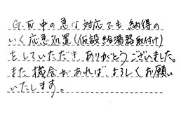 GW中の急な対応でも、納得のいく応急処置(仮設給湯器取付け)をしていただき、ありがとうございました。また機会があれば、よろしくお願いいたします。