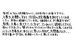 借家に取り付けをお願いしました。台風21号の直後で、借家人に色々不自由をかけており、早急のとりかえを希望しました。とり急ぎ臨時の仮設工事で解消され、本工事をゆっくり迎えることができました。感謝しています。