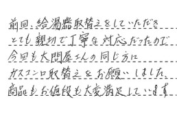ガスコンロの取替工事でお世話になりました。商品を選ぶ際も、親身になってくわしく説明してくれました。工事当日も、スムーズに取替してもらい、とても大満足しました。