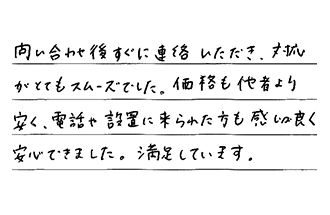 問い合わせ後、すぐに連絡いただき、対応がとてもスムーズでした。価格も他社より安く、電話や設置に来られた方も感じが良く、安心できました。満足しています。