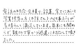 電話の対応、見積り、設置、全てにおいて、営業担当の方(村主さん)の仕事ぶりが素晴らしく、満足しています。年末にも関わらず、親切丁寧かつ迅速に対応して頂きました。