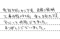 電話対応から、下見、見積り説明、工事日程の対応、全てよかったです。安心して依頼できました。ありがとうございました。