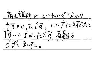 商品説明がていねいで分かりやすかったです。いい方に対応して頂いてよかったです。有難うございました。