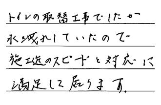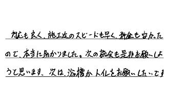 対応も良く、施工迄のスピードも早く、料金も安かったので、本当に助かりました。次の機会も是非お願いしようと思います。次は、浴槽かトイレをお願いしたいです。