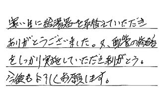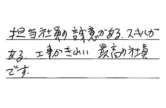 営業の方も工事の方も、尋ねた事に適切に返答いただいて、とても気持ち良かったです。また、価格も他社に対して10万円以上安くて、驚きました。