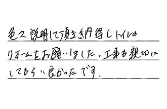 色々説明して頂き、納得し、トイレのリフォームをお願いしました。工事も親切にしてもらい、良かったです。