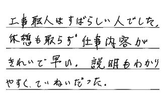 工事職人はすばらしい人でした。休憩も取らず、仕事内容がきれいで早い。説明もわかりやすくて、ていねいだった。