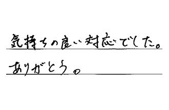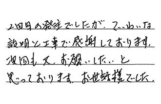 2回目の発注でしたが、ていねいな説明と工事で感謝しております。次回も又、お願いしたいと思っております。お世話様でした。