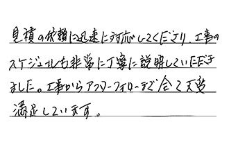 見積の依頼に迅速に対応してくださり、工事のスケジュールも非常に丁寧に説明していただきました。工事からアフターフォローまで、全て大変満足しています。