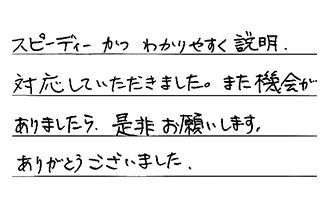 スピーディーかつわかりやすく説明・対応していただきました。また機会がありましたら、是非お願いします。ありがとうございました。