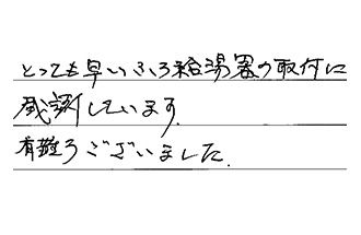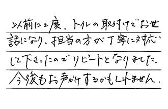 以前に2度、トイレの取付けでお世話になり、担当の方が丁寧に対応して下さったので、リピートとなりました。今後もお声がけするかもしれません。