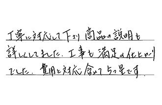 丁寧に対応して下さり、商品の説明も詳しくしてました。工事も満足の仕上がりでした。費用と対応含めて、5つ星です。