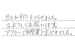 色々お手間をとらせました。又よろしくお願いします。アフター(調整等)完ペキでした。