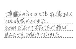 工事職人の方々は、とても礼儀正しく、とても好感がもてました。初めてだったので不安でしたが、頼んで良かったです。ありがとうございました。