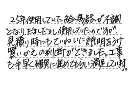 25年使用していた給湯器が不調となり、だましだまし使用していたのですが、見積り時にもていねいに説明をうけ、買いかえの判断ができました。工事も手早く確実に進めてもらい、満足しています。