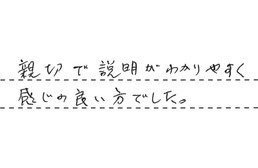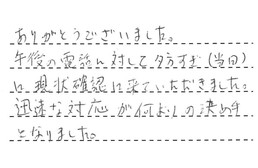 ありがとうございました。午後の電話に対して、夕方すぎ(当日)に、現状確認に来ていただきました。迅速な対応が何よりの決め手となりました。