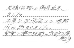 見積価格に満足出来ました。工事も約束通りの時間内に収まりました。営業+施工技術の方針に満足です。