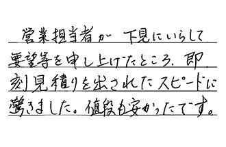 営業担当者が下見にいらして、要望等を申し上げたところ、即刻見積りを出されたスピードに驚きました。値段も安かったです。