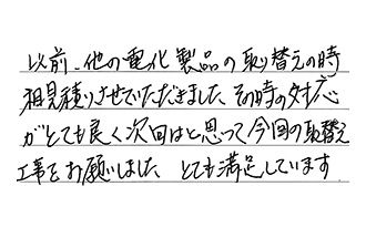 以前、他の電化製品の取り替えの時、相見積りさせていただきました。その時の対応がとても良く、次回はと思って、今回の取替え工事をお願いしました。とても満足しています。