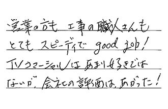 営業の方も工事の職人さんも、とてもスピーディで good job! TVコマーシャルはあまり好きではないが、会社の評価はあがった!