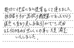 親切で他店にない提案をして頂きました。担当者の方が、高校の後輩であったという偶然も重なり、良いお取引ができ、次回また何かあれば宜しくとの事で、大変満足いたしました。