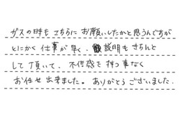 ガスの時もこちらにお願いしたかと思うんですが、とにかく仕事が早く、説明もきちんとして頂いて、不信感を持つ事なく、お任せ出来ました。ありがとうございました。