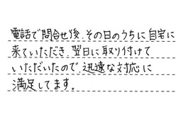 電話で問合せ後、その日のうちに自宅に来ていただき、翌日に取り付けていただいたので、迅速な対応に満足してます。
