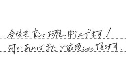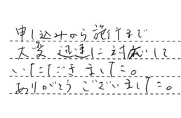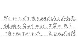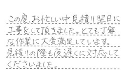 この度、お忙しい中、見積り翌日に工事をして頂きました。とても丁寧な作業に、大変満足しています。見積りの際も、夜遅くに対応してくださいました。