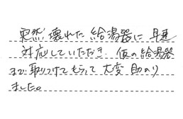 突然壊れた給湯器に、早速対応していただき、仮の給湯器まで取りつけてもらって、大変助かりました。