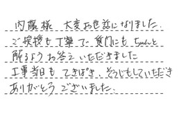 内藤様、大変お世話になりました。ご挨拶も丁寧で、質問にも、ちゃんと解るようお答えいただきました。工事当日も、てきぱきそうじもしていただき、ありがとうございました。