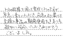 トイレの故障で困って電話したのですが、早急に来ていただき、応急の処置にて、交換工事迄の期間、使用できました。親切に対応いただき、ありがとうございました。