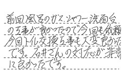 前回、風呂のガス・シャワー・洗面台の工事が良かったので、今回も依頼。今回、トイレ交換工事も大変良かったです。石井さんの対応が非常に良かったです。