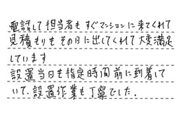 電話して担当者もすぐマンションに来てくれて、見積もりもその日に出してくれて、大変満足しています。設置当日も指定時間前に到着していて、設置作業も丁寧でした。