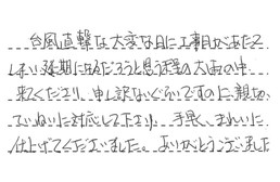 台風直撃な大変な日に、工事日があたってしまい、延期になるだろうと思う程の大雨の中来てくださり、申し訳ないぐらいですのに、親切・ていねいに対応して下さり、手早く、きれいに仕上げてくださいました。ありがとうございました。