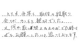 とても手早く、取付の段取り全てが、きっちり親切でした。又、何か取り替えるものがでた時は、ぜひお願いしたいと思っております。