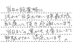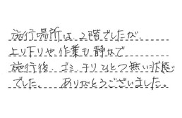 施工場所は2階でしたが、上り下りや作業も静かで、施工後、ゴミ、チリ、ひとつ無い状態でした。ありがとうございました。