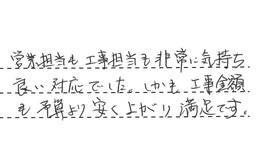 営業担当も工事担当も、非常に気持ち良い対応でした。しかも工事金額も予算より安く上がり、満足です。