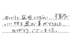 ゆっくりと説明してもらい、予算内でいい物を選ぶ事ができました。ありがとうございました。