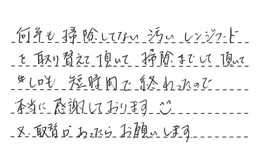 何年も掃除していない汚いレンジフードを、取り替えて頂いて、掃除までして頂いて、しかも、短時間で終わったので、本当に感謝しております。又、取替があったら、お願いします。